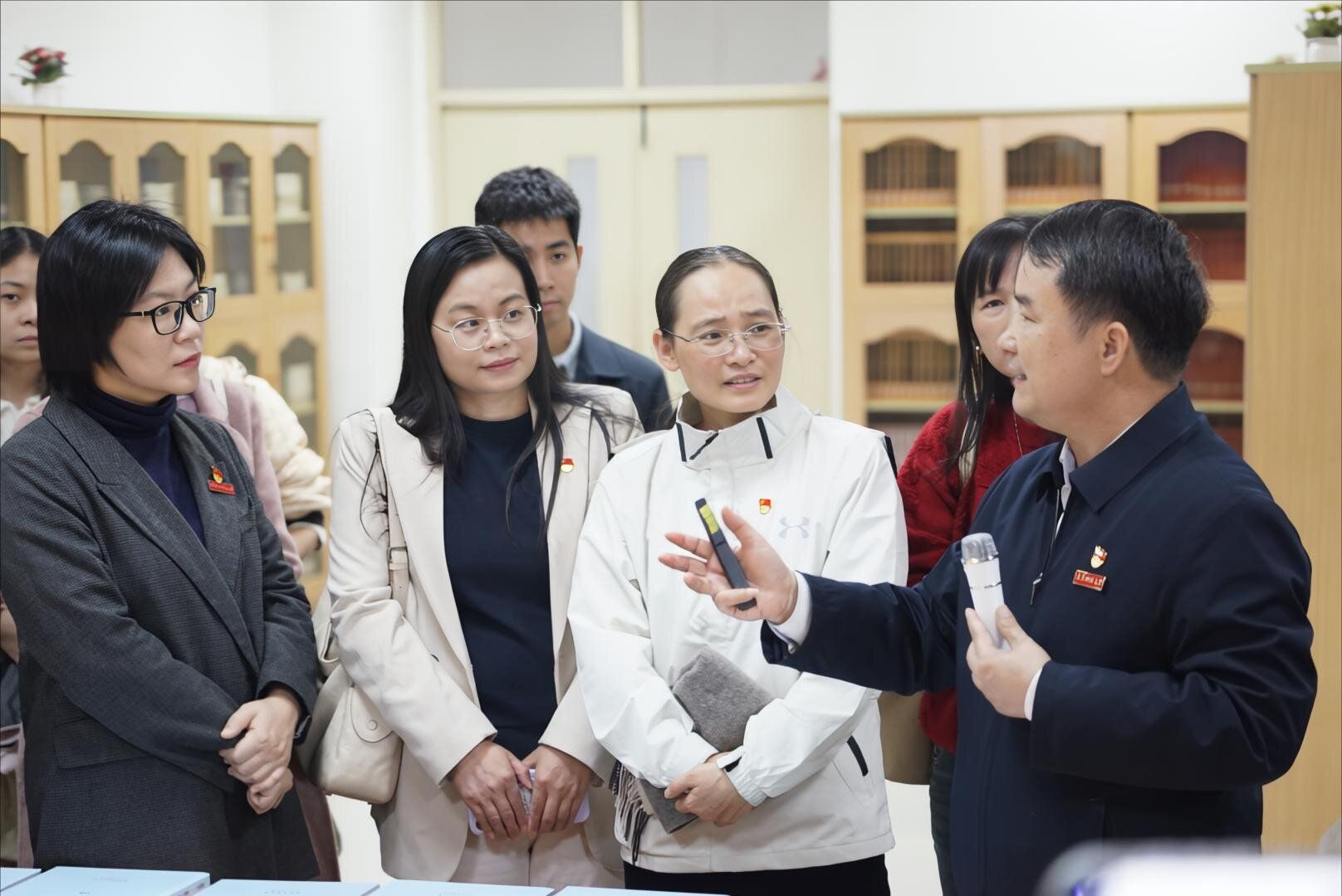 张龙海结合馆内丰富的实物与图文资料,围绕闽南文化的历史脉络、我校在闽南文化研究与人才培养方面的实践探索,以及如何以文化为纽带推动两岸融合等主题,展开了生动而深刻的讲解。他指出,党的二十届四中全会提出,要“发展具有强大思想引领力、精神凝聚力、价值感召力、国际影响力的新时代中国特色社会主义文化,扎实推进文化强国建设。”闽南文化是中华优秀传统文化的重要瑰宝,是连接两岸同胞的情感桥梁和精神家园。外国语学院应积极发挥语言优势,主动担当文化桥梁作用,让世界听见闽南故事,让两岸同胞共享文化根脉,培养兼具语言能力与文化使命的新时代人才,在促进文化交流、服务国家战略中展现外语人的独特担当。