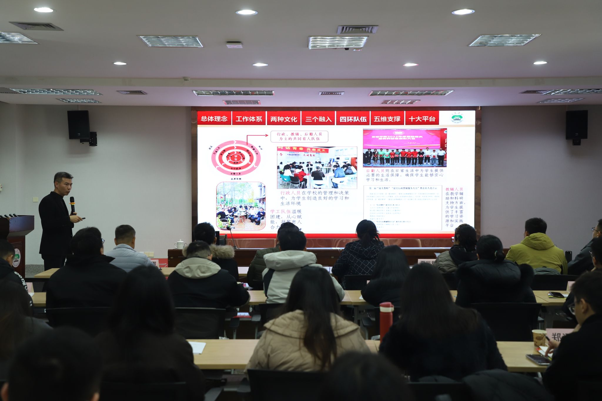 在专题讲座环节,龙岩学院学工部部长钟以流以《新时期高校辅导员工作方法的嬗变与创新》为题,详细介绍了龙岩学院辅导员工作创新的多维探索。龙岩学院陈秀香副教授以《深学笃行四中全会精神,接续推进中国式现代化》为题,立足高校育人工作实际对全会精神进行深入解读。