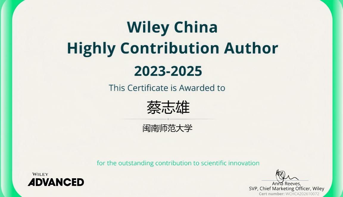 近日,我校化学化工与环境学院MOOM团队蔡志雄教授获评“2023-2025年度威立Wiley中国杰出作者奖”。