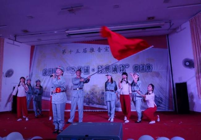 晚会由历史系姬康老师和教育系郭群老师的诗歌朗诵拉开序幕,接下来个人朗读赛开始,八首激昂奋进、铿锵有力的毛泽东诗词在舞台上依次响起,其中,中文系陈彬彬同学朗诵的《清平乐·蒋桂战争》和芗涛剧社唐俊山社长的《忆秦娥·娄山关》更是感人至深,仿佛令人回到了那段激情燃烧的峥嵘岁月,最后特邀参赛的漳州一中潘隽超同学一首《七律·长征》将晚会现场推向了第一个高潮,现场气氛热烈活跃、掌声雷动不息。而后,集体朗诵依次展开,毛泽东诗词、雷锋之歌、西沙之战再现了新中国诞生发展的雄伟道路,也让人体验到了经典的感染力,勾起了中华儿女的民族自豪感和前行的斗志与激情。