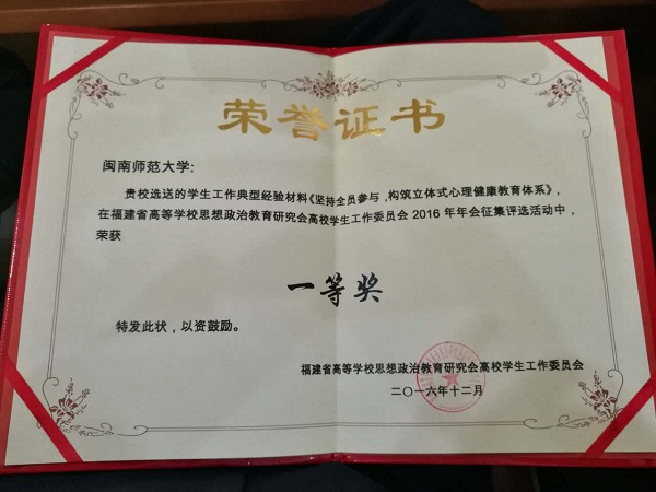 12月2日,福建省高等学校思想政治教育研究会高校学生工作委员会2016年年会在厦门大学召开,我校学生处处长林致远代表学校参加会议。会上公布了2016年全省学生工作典型经验评选结果,我校申报的《坚持全员参与,构筑立体式心理健康教育体系》在评选中荣获一等奖。