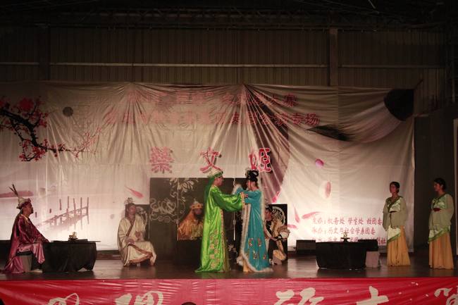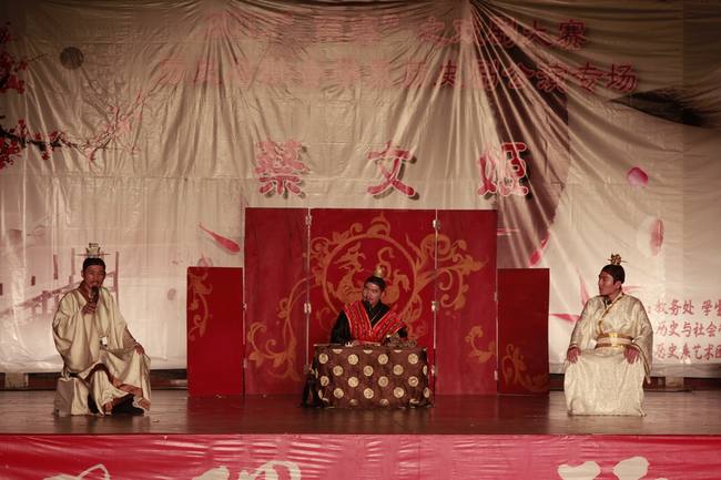 4月27日晚,由校教务处、学生处、校团委、关工委主办的2012“两赛”之戏剧大赛项目之一,历史与社会学系团委承办的大型历史剧《蔡文姬》公演在球类馆圆满落幕。