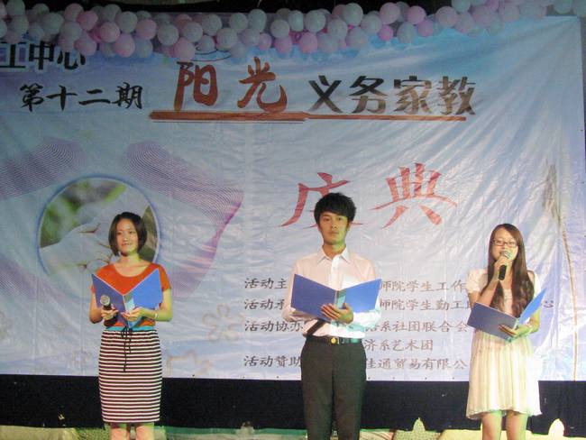 街舞秀拉开了晚会的帷幕。学生处副处长黄伟东致开幕词,校勤工助学服务中心代表温兰兰同学和优秀义务家教老师阙丽亚同学分别作了发言,他们希望更多的青年学子加入到义务家教的队伍中来,帮助那些需要帮助的孩子,通过持续的努力,将自己学习所得传授他人,以感恩的心回报社会,在劳动中感受真正的快乐。