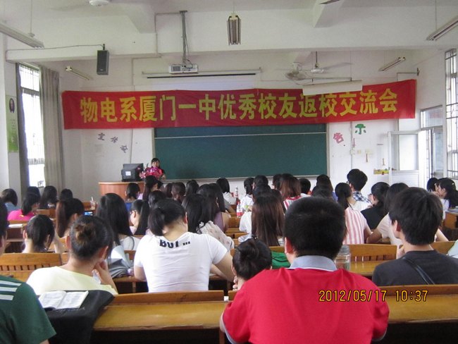 5月17日上午,物电系邀请厦门一中优秀校友在达南101室与08、09级物本专业学子进行返校交流。物电系党总支书记张跃聪、团委副书记胡莉丹及辅导员们出席了交流会。
