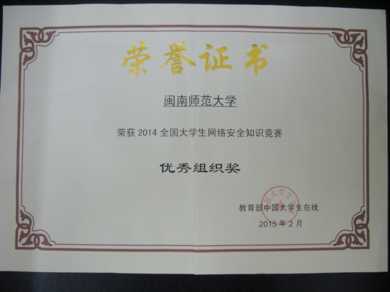 近日,教育部中国大学生在线公布了2014年全国大学生网络安全知识竞赛比赛结果,我校荣获比赛优秀组织奖。本届比赛吸引了全国1407所高校参与,共有20个高校荣获优秀组织奖。