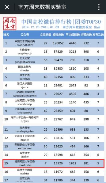 日前,南方周末数据实验室出品的“中国高校微信排行榜丨团委TOP30”(2014.12.28—2015.01.03)榜单再次发布。我校团委微信公众号“闽南师范大学团委”(微信号:mnsfdxtw)以13526的总阅读量再次位居榜单第15位,并且1月2日推送微信单图文《闽南师范大学版小苹果》在网络窜红,截至1月9日获得15645的高人气点击阅读量。
