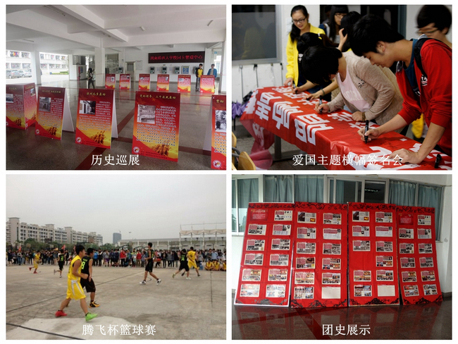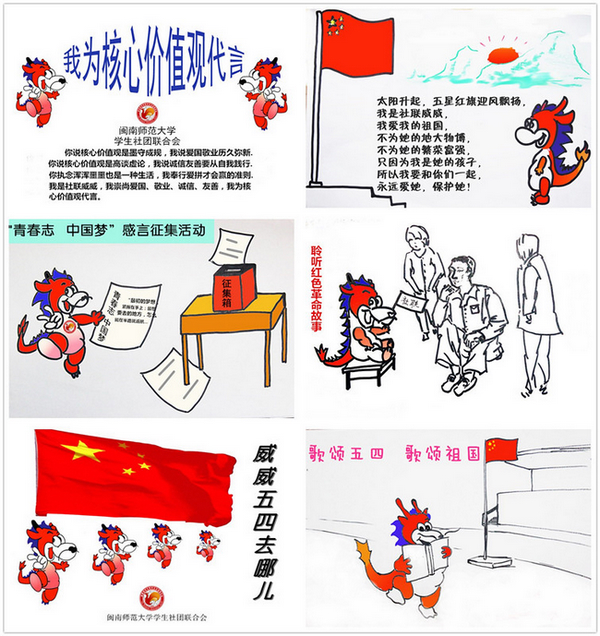 校团委下属各学生组织以多种方式纪念五四运动95周年,激励广大团员青年大力发扬五四精神,以奋斗实干的行动成就出彩人生。校青年宣传中心5月4日达理活动中心一楼开展了“纪念五四 铭记团史”系列展览,从共青团初展英姿到搏风击浪再到辉煌岁月,向青年学生展示了团的历程;校青年宣传中心利用微信平台向广大学生推送“五四纪念特辑:永不褪色的记忆”,用文字激发青年之志;校社团联合会发挥青年主观能动性,创造了“小龙威威”的卡通形象带领青年学子向奉献之路走去、校社团联合会于4月3日在达理活动中心一楼承办“漳州历史大巡展”活动,5月4日,校社联举办以“弘扬五四精神,点燃爱国热枕”为主题的纪念活动,让青年学子时时刻刻铭记身为中国青年之使命,革命成功之艰辛,珍惜来之不易的今天,奋斗越来越好的明天。校微博管理服务中心以“筑梦五四 奋斗青春”为主题开展微博话题讨论,让青年学生抒发青春宣言,一天内获得近百次转发及讨论;艺术团于5月4日于龙文馆开展了“《我的1919》光影展播”活动,通过播放影片《我的1919》为青年学子还原出历史的苦难和先辈们不屈的脊梁,号召青年学生勇担民族道义。
