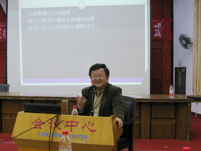 来自台湾师范大学的廖凤池教授带来了一场主题为“朋辈辅导之心理咨询谈话技巧”的讲座。廖教授以轻松幽默的语言,结合自身30多年心理咨询工作经验和实践,以生动的案例深入浅出地阐释了艰深的心理学知识。他先以谈话与说话的区别开题,指出与人进行良好沟通谈话中应注意同理心的运用,进入对方内在参考框架下进行沟通,切忌只关注自己关心的话题。他介绍了六点人际沟通的方法:一、增进自我了解;二、敏锐觉察及同理心的了解;三、使用澄清技术;四、重视回馈;五、适时表露自我以增加亲切感;六、保持真诚与一致性的态度。讲座最后,廖教授以“与人分享快乐,快乐会加倍;和人分担痛苦,痛苦会减半”与在场师生共勉。近两个小时的讲座中,师生们被廖教授的专业、诚恳和亲切深深地吸引和打动,大家认真听讲,专心记录,现场时时传来会意的笑声和热烈的掌声,整场讲座气氛融洽,收到了良好的效果。