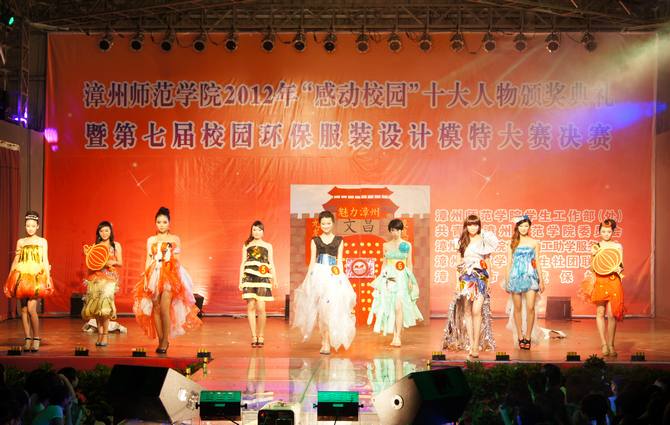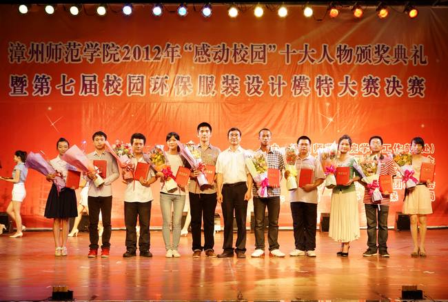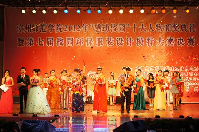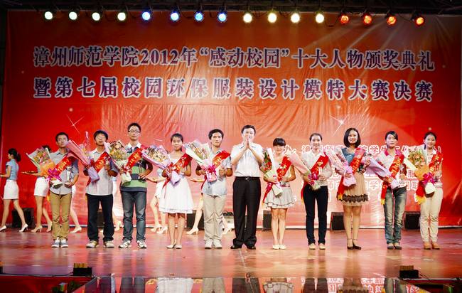 5月27晚,由校学生处、校团委主办,校学生勤工助学服务中心、校学生社团联合会承办的“漳州师范学院2012年‘感动校园’十大人物颁奖典礼暨第七届校园环保服装设计模特大赛决赛”在校球类馆隆重举行。校党委林晓峰书记、校党委林春生副书记、校各部处领导、各系党总支部领导、各系团委负责老师、漳州市环保局代表,以及校各单位、各系老师代表出席本次晚会。
