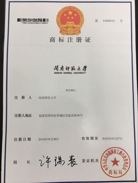 视觉形象识别系统是以机构标志、标准字体、标准色彩为核心展开的完整、系统的视觉传达体系,通过将学校的办学理念、文化特质、制度规范等抽象语意转换为具体的符号概念,塑造出独特的学校形象。为更好地保护校名等无形资产,防止恶意侵权行为,维护学校声誉,2015年我校开始申请注册“闽南师范大学”在第16类办公用品类、第41类学校教育类、第42类科研类等3个类别共12件商标。经过多方努力,目前已经通过国家工商行政管理总局商标局的审核,全部注册成功。