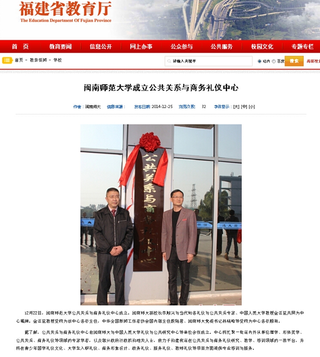 近日,福建省教育厅网站主页连续报道我校最近校园新闻,一则为《闽南师范大学成立公共关系与商务礼仪中心》;另一则为《台湾高雄第一科大与闽南师范大学共育金融人才》。现转刊如下: