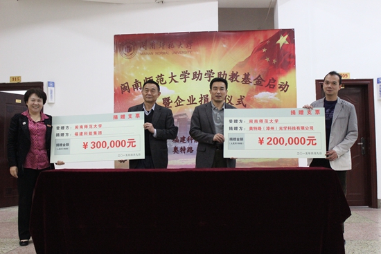 我校助学助教基金于4月9日下午正式启动。福建科能集团和奥特路(漳州)光学科技有限公司是首批捐赠企业,福建科能集团捐赠30万元,设立科能助学金,奥特路(漳州)光学科技有限公司捐赠了20万元的款物。