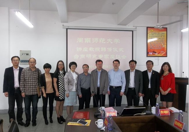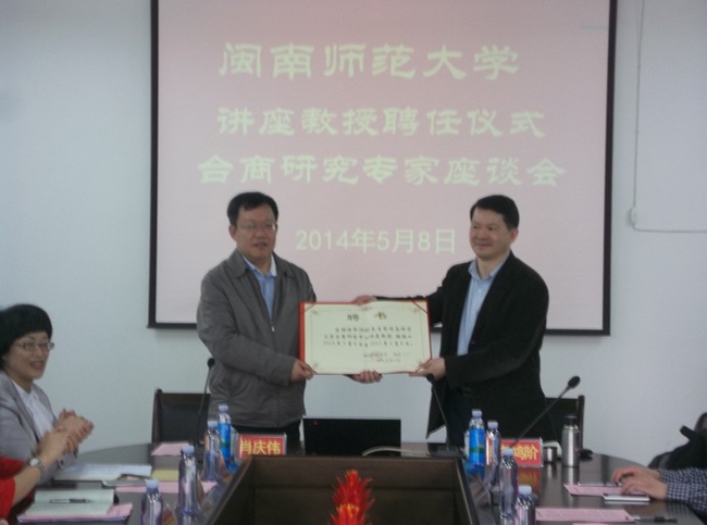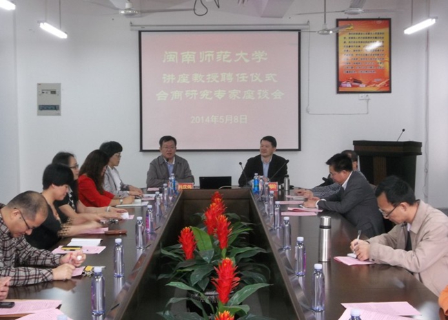 为了进一步合理定位台商研究中心的研究方向,打造特色研究基地,5月8日上午在经济学院会议室举行“闽南师范大学讲座教授聘任仪式暨台商研究专家座谈会”。福建社会科学院副院长、研究员李鸿阶受聘为闽南师范大学讲座教授。副校长肖庆伟、人事处、闽南文化研究院、社科处负责人,经济学院和台商研究中心教师参加了本次会议。