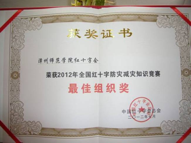 校红十字会荣获2012年全国红十字防灾减灾知识竞赛“最佳组织奖”。