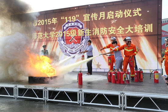 11月7日上午,漳州市2015年“119”宣传月启动仪式暨闽南师范大学2015级新生消防安全大培训活动在西区篮球场举行。此次活动由漳州支队与我校联合主办,校保卫处、学生处承办,我校5000多名大一新生参加了消防安全培训。