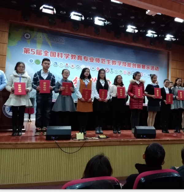 本次大赛,化学与环境学院领导高度重视,精心组织,从赛前选手选拔、学生培训等方面倾注了大量精力,最终我校化学与环境学院科学教育专业的吴淑瑶同学获小学科学组特等奖,叶晓芳同学获得小学科学组一等奖,杨妙霞老师获本次大赛优秀指导教师奖。整个展示活动充分展示了我校科学教育专业师范生在师范技能、创新思维、临场应变等方面的能力。此次取得的成绩充分肯定了我校科学教育专业现有教学模式,同时也为我校科学教育专业进一步发展奠定了良好的基础。