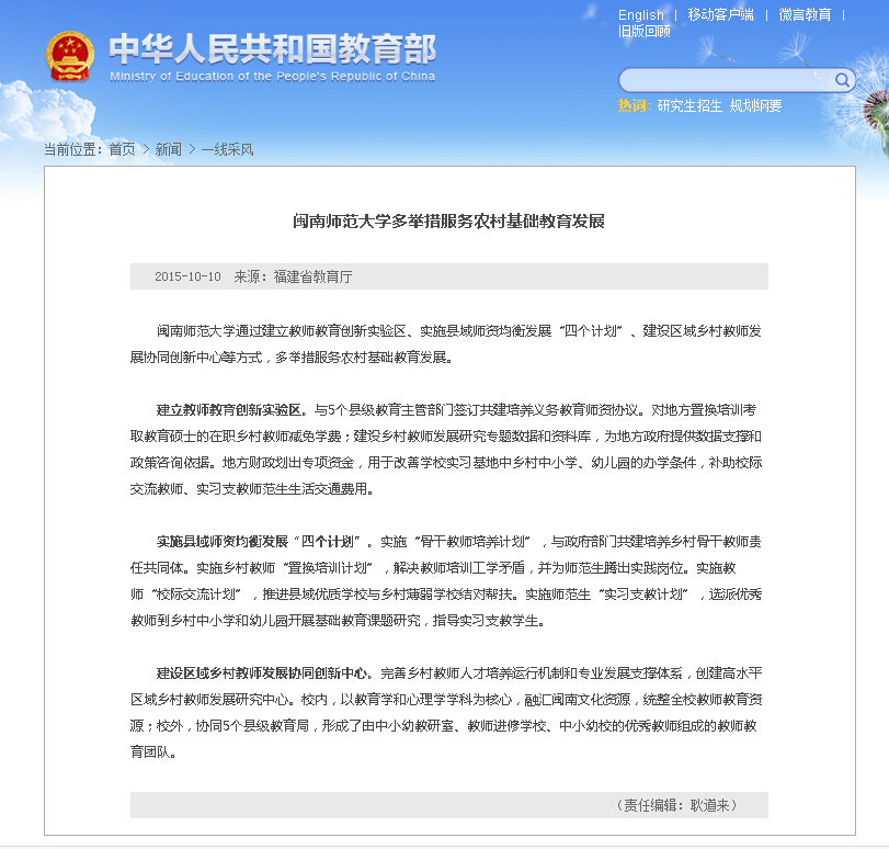 10月10日,教育部网站新闻栏目刊登我校多举措服务农村基础教育发展的做法,现转载如下: