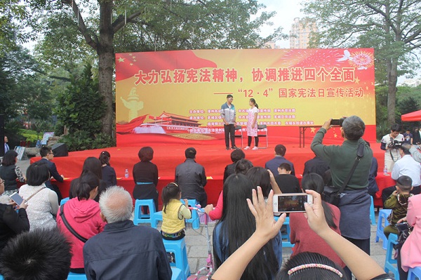 为进一步开展国家宪法日宣传活动, 12月4日,漳州市依法治市办、漳州市宣传部、漳州市司法局、芗城区司法局、闽南师范大学法学与公共管理学院、法治漳州研究中心等有关单位联合在漳州市芗城区中山公园举办“12﹒4”国家宪法日普法情景剧展演活动。漳州市副市长、公安局长黄华安,我校副校长蒋一婷等领导出席展演现场,法学与公共管理学院党政领导、漳州市直有关单位工作人员及广大市民群众观看了展演活动。