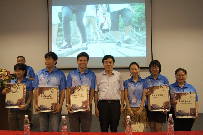 闭营式上,漳州师范学院闽南文化研究院同台湾6所高校互赠礼品。金门大学刘名峰老师代表参加此次活动的各团体领队对漳州师院热情周到的安排表示衷心感谢。他认为闽南文化是中原文化与区域文化双向互动的二元文化,对其研究如用结构主义的理论诠释,应能突显闽南文化作为边陲文化的特质及其生命力与创造力。明道大学尤世萩同学代表全体学员表示,通过研习、交流及参观考察,让大家体会到“闽台缘,两岸情,一家亲”的真正含义,让两岸高校青年学子的心贴近了,希望以后还有机会再来闽南、来漳州进行交流。