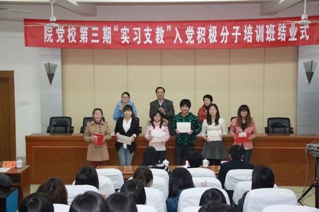 3月7日晚7点30分,院党校第三期“实习支教”入党积极分子培训班结业式于我校逸夫楼三楼报告厅隆重举行。出席结业式的有党校常务副校长陈朱文副教授、校组织部组织科副科长徐志红助理研究员,同时出席第三期“实习支教”积极分子培训班的还有数学、历史、教育、生物等各系领队、全体学员和党校助理,结业式由党校曾芳老师主持。