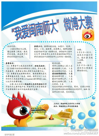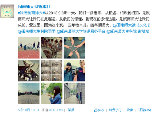 活动开展期间,同学们发布了近两百条微博,包括长微博、短微博、图片、视频等,一条条精心设计的微博,从细微中见真情,从吐槽中见关切,让我们看到了同学们眼中的闽南师大,更看到了他们心中的母校形象,让我们感受到了满满的正能量,更增加了前行的力量!这些微博关注的人数在活动期间成倍增加,并被大量转发和评论。在决赛投票环节中,合计阅读量达上万人次,在校内引起了良好反响。结合网络投票和评委评分,《闽南师大我们和你一起成长》、《献给您—闽师大的歌》、《我爱闽南师大,我爱12食安》和《三十年勤工情》等九条微博脱颖而出,让我们一起给他们点个赞吧!