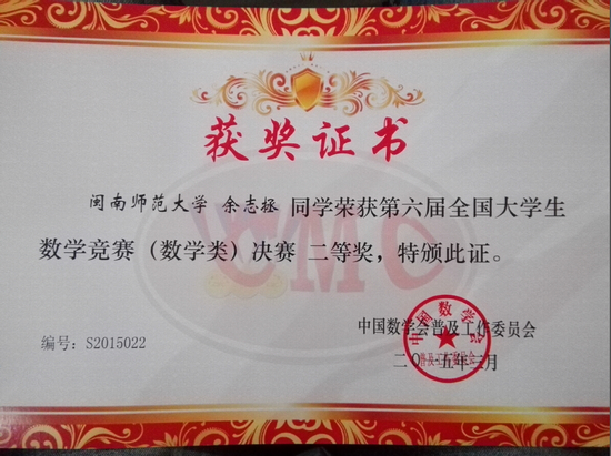 近日,传来喜讯,我校数学与统计学院余志拯同学荣获第六届全国大学生数学竞赛(数学类)决赛二等奖,高年级组排名15,位列二等奖第三位,该同学在福建赛区比赛中脱颖而出,被推荐参加全国总决赛,通过努力取得了佳绩,为母校赢得了荣誉。