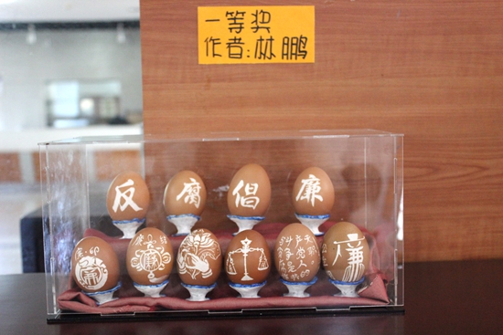 本次征集比赛历时一个多月,征集的作品形式多样,包括书法、雕刻、剪纸、油画、漫画、水粉画等。艺术学院陈磊同学的书法作品《高风亮节》和林鹏同学的蛋雕作品《反腐倡廉》分别获得了一等奖。