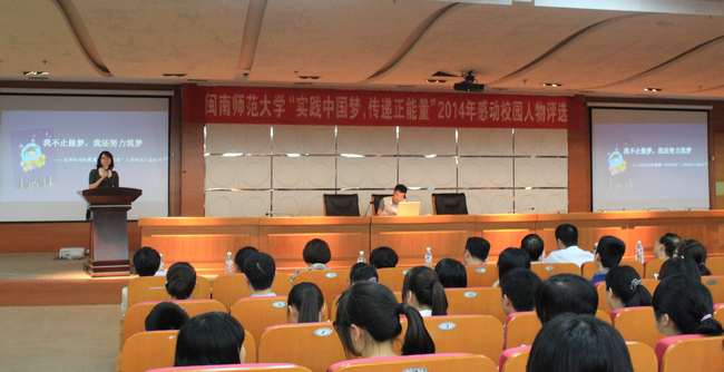 经过各学院推荐、网络公投、学生大众评审投票后,20名进入复选的优秀学子进行最后的感人事迹展示。三个多小时的动人讲述,让在场师生再次接受心灵的洗礼。经过现场投票,最终评选出陈燕惠(生物科学与技术学院)、罗耀桥(计算机学院)、郑会敏(教育科学学院)、上官清(化学与环境学院)、蔡秋(物理与信息工程学院)、林茜茜(管理学院)、方瑶(新闻传播学院)、周志军(经济学院)、刘婉晴(文学院)、冯翠林(艺术学院)等10名感动校园人物”;洪燕凤(物理与信息工程学院)、张薇(生物科学与技术学院)、吴彩华(外国语学院)、张思琪(外国语学院)、林丙永(化学与环境学院)、肖霞(文学院)、贾佳(化学与环境学院)、林钧(计算机学院)、郑丽鸿(计算机学院)、卢秀惠(教育科学学院)等10名感动校园人物提名奖获得者。
