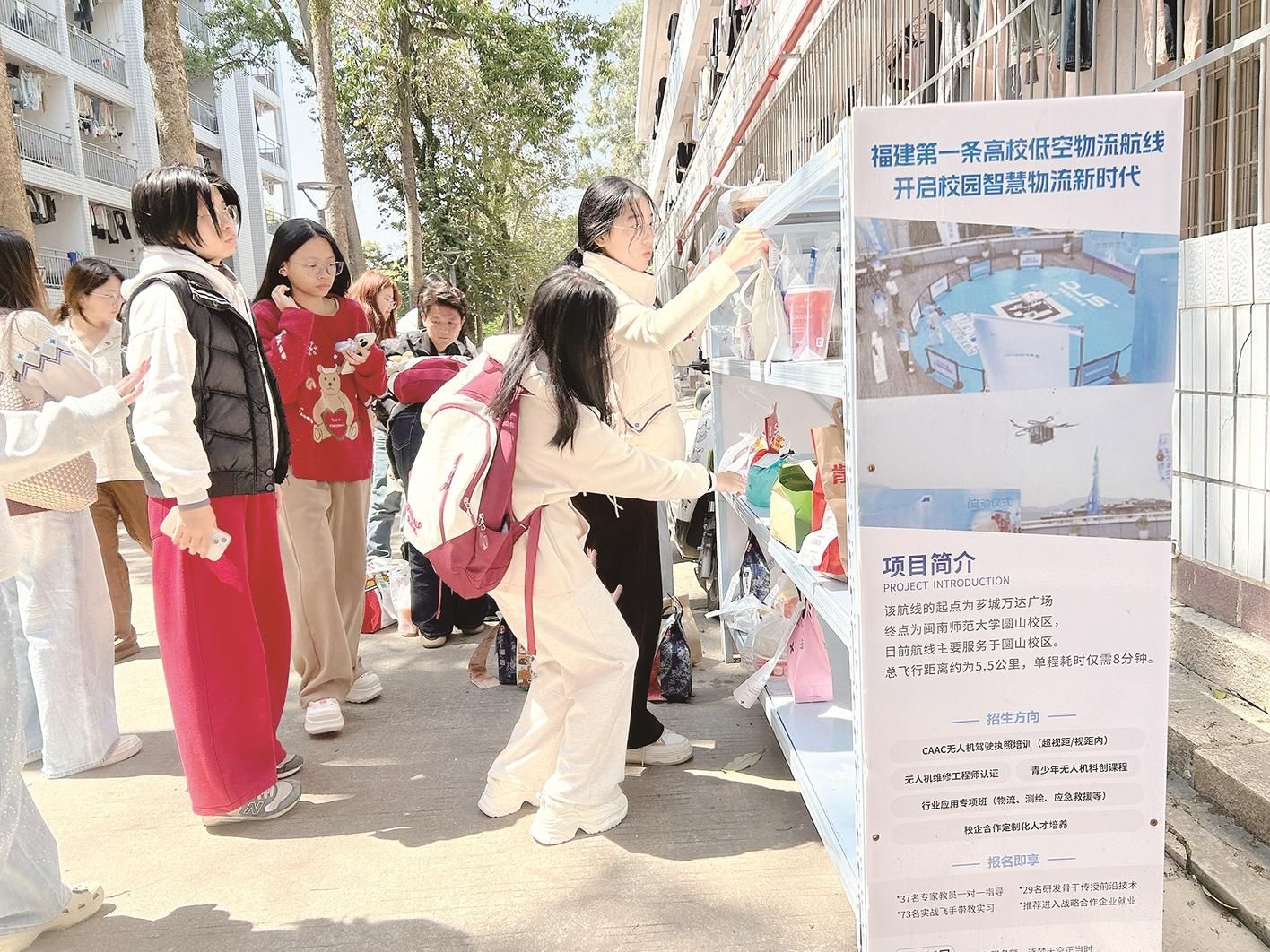 像孙嘉怡和田爽爽这样参与末端配送的学生,目前共有六人。她们负责订单配送、货架管理等,构成了一条连接“停机坪”到“宿舍楼”的人力传送带。