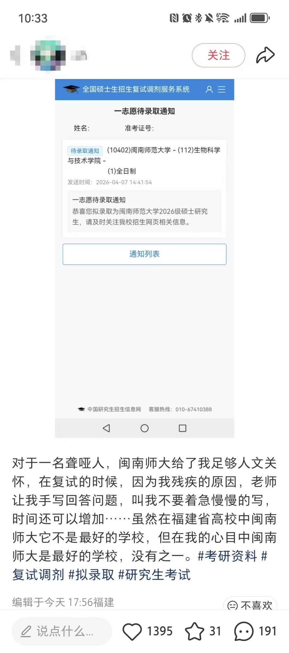 收到拟录取通知后,该考生在社交平台上分享:“虽然在福建省高校中闽南师大它不是最好的学校,但在我心目中闽南师大是最好的学校,没有之一。”这句真诚的评价,在短短几小时内收获千余点赞,许多网友留言:“这才是教育应有的样子。”“人文关怀比排名更动人。”