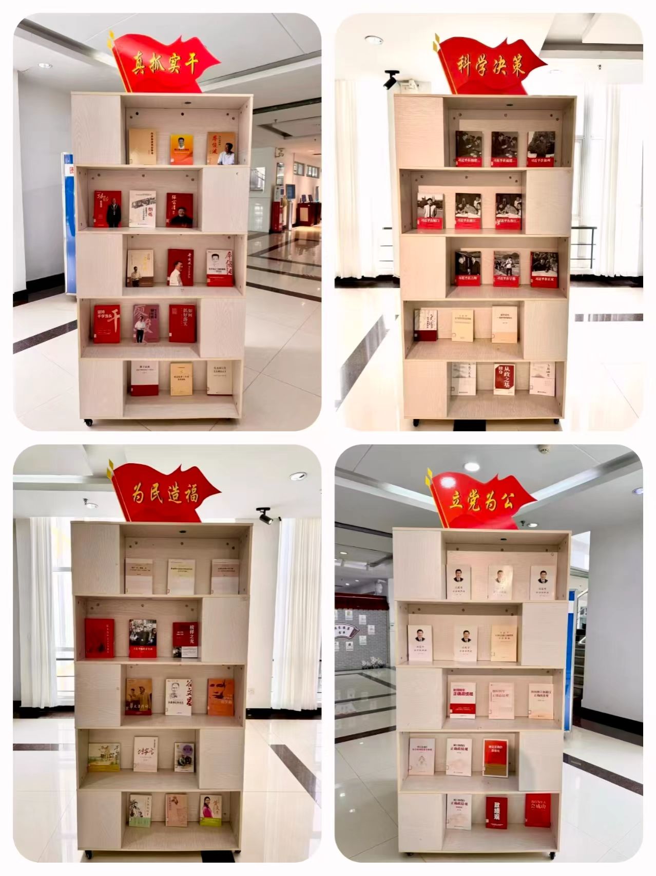 “立党为公”专区聚焦党的初心使命,集中陈列《习近平谈治国理政》《习近平关于树立和践行正确政绩观论述摘编》等权威著作及正确政绩观专题解读文献,阐释执政为民的根本宗旨,筑牢理想信念根基;“为民造福”专区以民生实践为主线,收录《习近平的七年知青岁月》《榜样之光:一座不朽的丰碑谷文昌》等纪实专著,搭配基层服务、群众工作相关案例读物,展现扎根基层、服务群众的为民情怀;“科学决策”专区精选《习近平在福建》《习近平在浙江》《习近平在正定》等系列著作,解读科学谋划、精准施策的治理智慧;“真抓实干”专区聚焦担当作为,展出《功勋张富清》《公仆廖俊波》等先进典型读物,弘扬求真务实、攻坚克难的奋斗精神。
