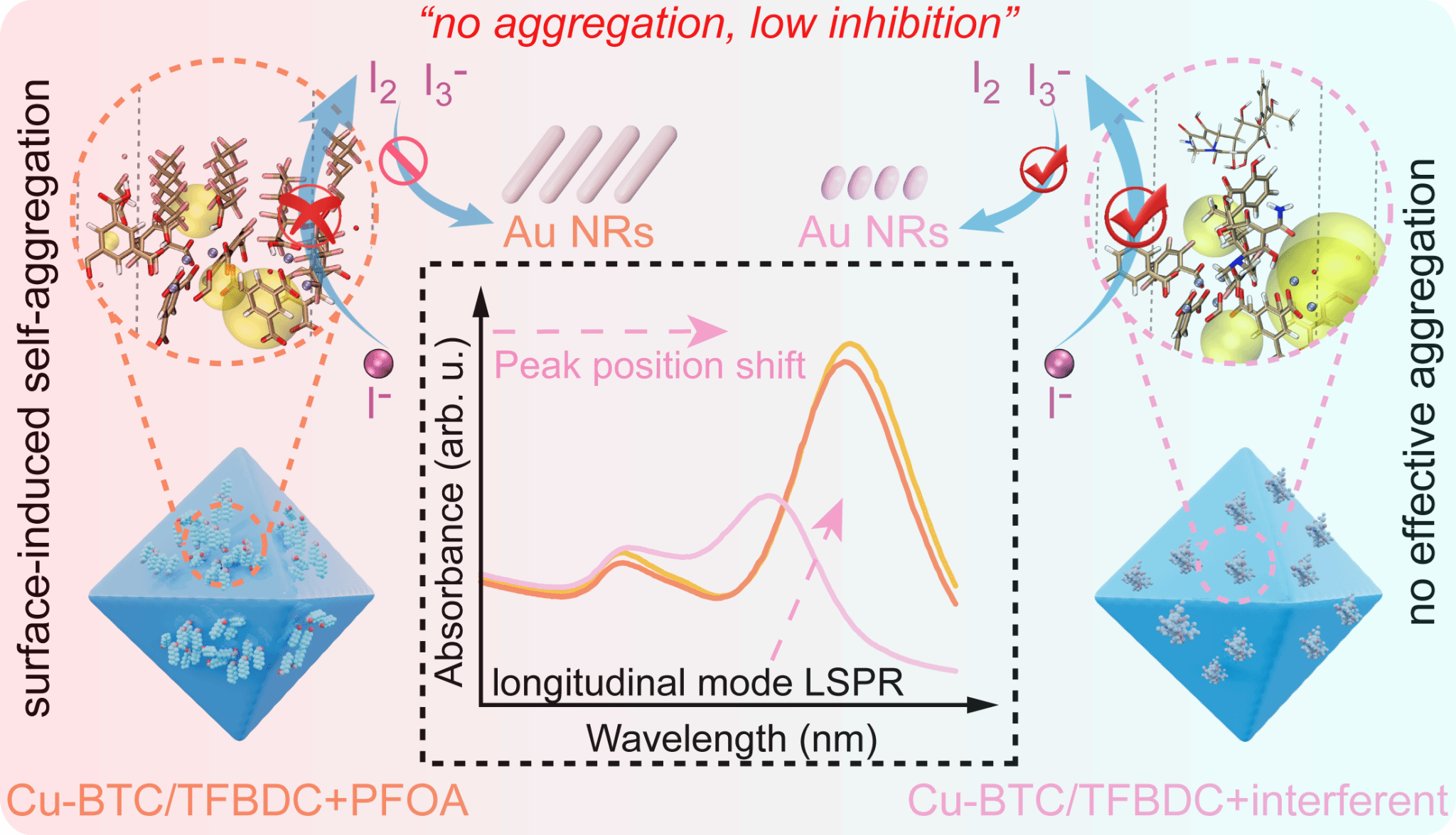 PFAS因其极高的化学稳定性和环境持久性,被广泛视为一类极具威胁的新污染物。然而,传统PFAS检测高度依赖昂贵的大型质谱仪器;而现有比色传感方法多为单色信号(肉眼分辨率低),难以实现现场高灵敏筛查。碘离子介导的金纳米棒(Au NR)刻蚀系统虽可以实现多色比色传感,但依赖外源氧化剂(如H2O2)或酶促反应,不适合PFAS此类化学惰性污染物。有鉴于此,该工作受经典碘滴定法测铜离子浓度启发,在理论预计算的指导下,通过溶剂热策略合成了一种双配体铜基金属有机框架(Cu-BTC/TFBDC),并与碘离子介导的Au NR刻蚀系统相结合,首次构建了一种无氧化剂、无酶驱动的多色比色传感平台,实现了对PFAS的高效可视化筛查(图1)。在该设计中,MOF骨架实现了内源性Cu2+氧化位点与氟化识别配体(TFBDC)的耦合。