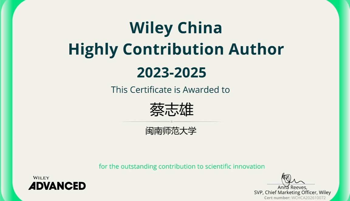 蔡志雄教授在2023-2025年间,在Wiley旗下期刊共发表10篇论文,其中包括Angew. Chem. Int. Ed. 2篇, Adv. Funct. Mater. 1篇,Chem. Eur. J. 2篇, Adv. Opt. Mater. 1篇等,累计下载量达13405次(数据统计截止2026年2月9日)。为致敬其这一阶段的持续学术贡献,Wiley中国特授予蔡志雄教授“2023-2025年度威立Wiley中国杰出作者奖”荣誉称号。