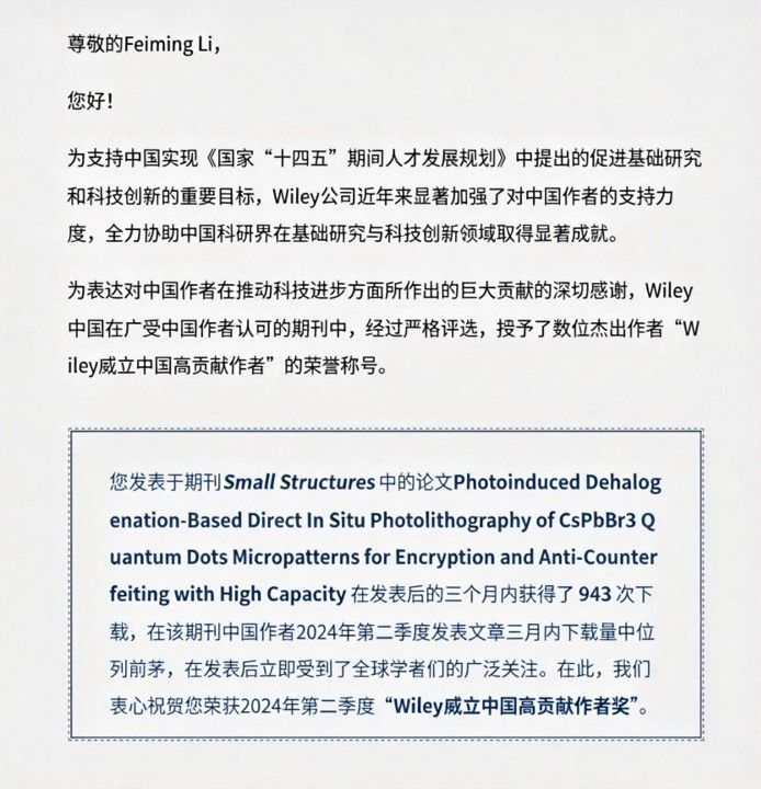 李飞明副教授发表于Wiley集团出版期刊Small Structures的论文“Photoinduced Dehalogenation based Direct In-situ Photolithography of CsPbBr3 Quantum Dots Micropatterns for Encryption and Anti-counterfeiting with High Capacity” ,一经发表便备受关注,该文在该期刊中国作者2024年第二季度发表文章三月内下载量中位列前茅。为此,Wiley中国授予李飞明副教授2024年第二季度“威立Wiley中国高贡献作者奖”荣誉称号。